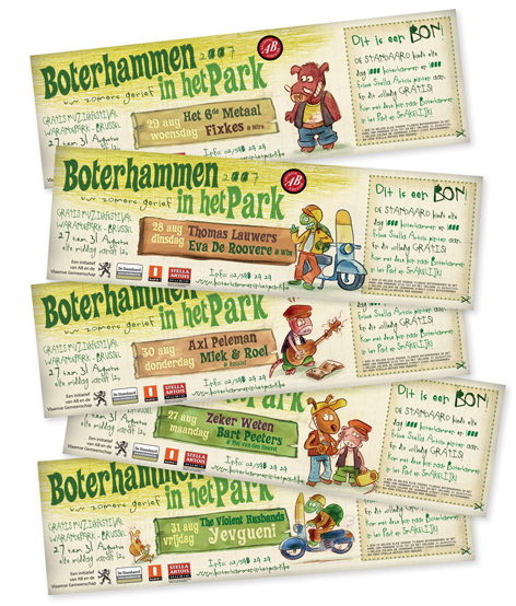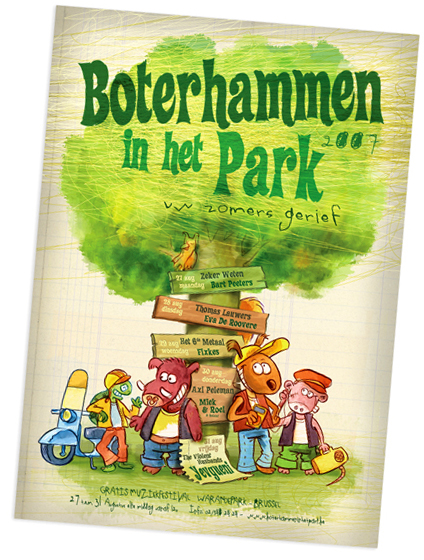 Sneak preview of the poster for the upcoming annual free ‘Boterhammen in het Park’-music festival by the Ancienne Belgique (‘www.abconcerts.be’). Since the start of the festival Eek the squirrel has been the eye-catcher of all the ‘Boterham’-posters and publications. The 2007 poster and illustrations where the result of a gloomy sunday afternoon brainstorm with AB’s MarcDC and is kind of an hommage to the eighties ‘Frank Margerin’ comics. Visit the free Boterhammen-festival in Brussels Warandepark 27 till 31 of august, 2007. more info on ‘www.boterhammenindestad.be’.