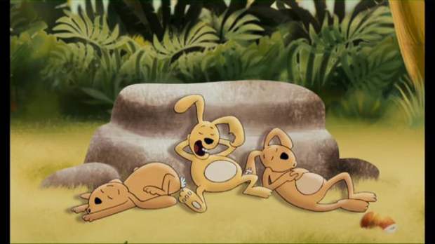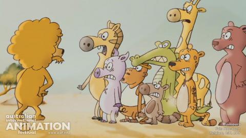 Taking advantage of the beautiful summer afternoon, three hares take a nap in the middle of the jungle. Suddenly, a noise rings behind the foliages. Panicked, the rodents flee, entailing in their trail all the animals of the jungle. Only the lion will know how to stop them by revealing, indeed in spite of himself, the origin of the mysterious noise source of this crazy rumour.