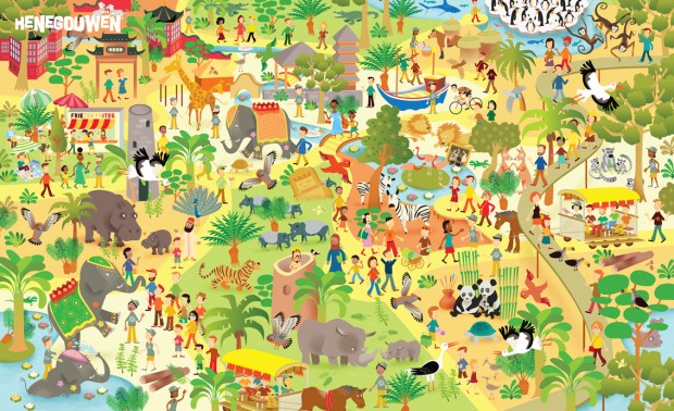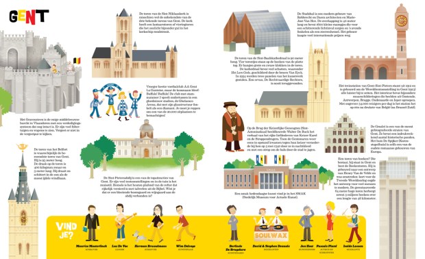 Onder de ambitieuze titel ‘België’ wijdt illustrator en vormgever Gunter Segers verschillende hoofdstukken aan steden en landstreken, zoals ‘de kust’, ‘Brugge’, ‘de Ardennen’, ‘Limburg’, ‘Luik’, ‘Aalst en Dendermonde’. Segers hanteert een herkenbare structuur: hij opent ieder hoofdstuk met een tekstloze overzichtsprent, verspreid over één of twee dubbele pagina’s. Vervolgens worden enkele beroemde kunstwerken, opvallende architectuur, historische figuren, bekende Belgen en streekgebonden producten uitgelicht, zowel in woord als beeld. Dat reveleert vooral een grote diversiteit, wat de voorflap al deels weerspiegelt. Segers opent z’n lijvige cadeauboek met de grootste publiekstrekker; de Belgische kust. Na een overzichtsprent met de typerende drukte op een overvol strand, zoomt de illustrator op enkele markante figuren en gebruiken in. Aan bod komen o.a. de garnaalvissers te paard, het Zwin, de kusttram en de pier van Blankenberge. De informatie, geschreven door Paul De Moor, bevat vaak niet meer dan enkele zinnetjes. Bij gebouwen ligt de focus sterk op technische informatie. Ondanks de beperkte lengte weet de auteur met behoorlijk informatieve alinea’s te overtuigen. ‘België’ fungeert zo als goed uitgewerkte kennismaking en biedt tegelijkertijd een stevige aanzet tot verdere exploratie. Her en der neemt De Moor een anekdote op; een welkome aanvulling die gerust uitgebreid mocht worden.
