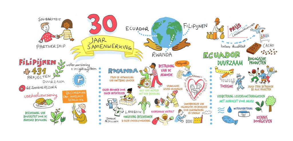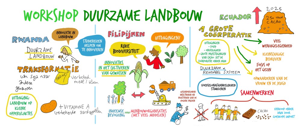 Alle ideeën worden ter plekke door Gunter LIVE gevisualiseerd en geven zo aanleiding tot discussie en nieuwe inzichten. Heldere tekeningen kunnen complexe processen visueel maken. De tekeningen – de ‘visuele oogst’ – wakkeren de interactie aan op het moment zelf. Dit werkt zeer stimulerend en productief op de dag zelf, en vormt een uniek verslag achteraf. De tekeningen kunnen achteraf worden gebruikt voor interne communicatie, publicaties of synopsissen van je event. Er kan ook een boek worden gemaakt op basis van het visuele verslag.